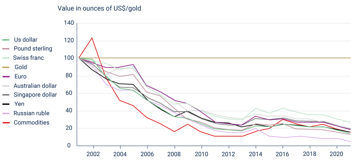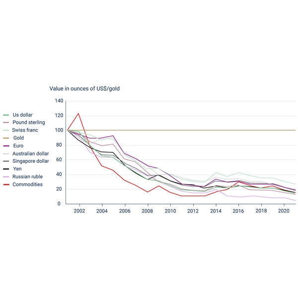 Gold retains its purchasing power over decades. Fiat currencies lose on average 6-9% of their value against gold every year (“inflation”) due to the expansion of the money supply. Since the abolition of the gold backing of the US dollar in 1971, almost all unbacked currencies have lost more than 90% of their purchasing power. The US dollar has lost as much as 97% of its value against gold. The purchasing power of the euro has fallen by 77% in the 20 years since its introduction in 1999. After all, the Swiss franc has depreciated by only 70% against gold.